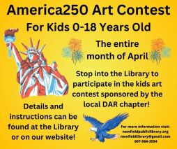 Celebrate America 250 with an art contest for kids 0-18 years old sponsored by the local chapter of the Daughters of the American Revolution! During the month of April stop into the Library to pick up a blank sheet of paper, an entry form, and review the instructions. The contest celebrates the upcoming 250th anniversary of the United States and encourages young artists to reflect on America’s past, present, and future.