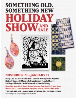 Holiday exhibition that runs through Jan. 17. Features works by ten artists, mediums include ceramics, painted wood carvings, hand-dyed organic indigo scarves, paper earrings with silver wires, one-of-a-kind note cards, and wood-block limited edition animal prints -- sheep, geese, frogs and a heron-- many with delightful imaginary scenes of frolicking possums. Established artists and newcomers too. The gallery is open Saturdays 11-2 and every day with a text (315-941-9607), call (607-547-5327) or email (leartgarage@gmail.com).