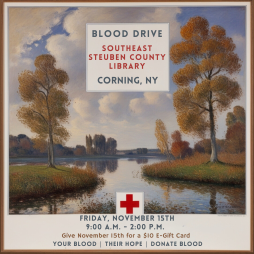 Join us for a critical blood drive on November 15th at the Southeast Steuben County Library in Corning, NY! 🩸 All donors will receive a $10 e-gift card as a thank you for their generosity.