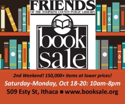 Friends of the Library Book Sale at 509 Esty St, Ithaca. 2 more long weekends: Sat-Mon, Oct 17-20 & Sat-Tues, Oct 25-28, hours: 10am-8pm. 150,000 gently used books, DVDs, CDs, puzzles, games & more, sorted into 70+ subjects for easy shopping. Prices drop each day. For more information, visit www.booksale.org