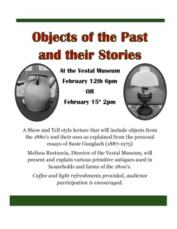 A Show and Tell style lecture that will include objects from the 1880's and their uses as explained from the personal essays of Susan Gunglach, Vestal Resident (1887 -1975). Melissa Restuccia, Director of the Vestal Museum , will present and explain various primitive antiques used in household farms of the 1800- 1900's. Coffee and light refreshments provided, audience discussion is encouraged.