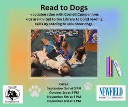 Children are invited to the Newfield Library to practice their reading skills by reading to one of Cornell Companion’s volunteer therapy dogs! Cornell Companions is an all-volunteer organization sponsored by the Cornell University Veterinary College in their 26th year of providing beneficial animal assisted activities to the community.