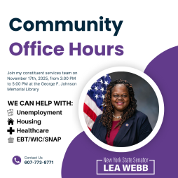 Please join the Office of New York State Senator Lea Webb for “Community Office Hours” on November 17, 2025, from 3:00 PM to 5:00 PM at the George F. Johnson Memorial Library, located at 1001 Park St, Endicott, NY 13760. Senator Webb’s constituent services team will be on hand to assist the community with issues they are experiencing, including unemployment, housing, healthcare, utility bills, EBT/WIC/SNAP, and more.