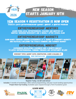 The new season starts on January 10th and all 5 monthly workshops (1/10, 2/7, 3/7, 4/11, 5/2) will be hosted in person at Ithaca’s premier incubator space, REV: Ithaca Startup Works (314 E. State Street) from 10AM-Noon. Additionally, we’re hosting 16 after-school hands-on working sessions, “Get Messy Lab,” at New Roots School (116 N. Cayuga Street) from 4PM-5:30PM on Wednesdays in between workshops. *Grades 4+
