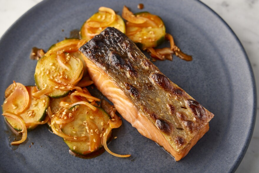 Crisp-Skinned Broiled Salmon with Cucumber Sesame Salad